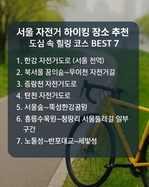 바쁜 도시 생활 속에서도 건강을 챙기며 여유를 누릴 수 있는 방법 중 하나가 바로 자전거 하이킹입니다. 서울은 의외로 자전거도로와 자연경관이 어우러진 명소들이 많아 주말이나 퇴근 후 가볍게 떠나기 좋습니다. 오늘은 서울 자전거 하이킹 추천 장소 7곳을 소개하며, 각 코스의 특징과 난이도, 접근성 등을 자세히 알려드릴게요.