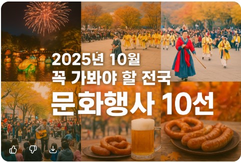 이번에 소개한 10월 문화행사 10선은 각 지역만의 색깔이 뚜렷해, 짧은 주말여행이나 가을 휴가 코스로도 좋습니다.